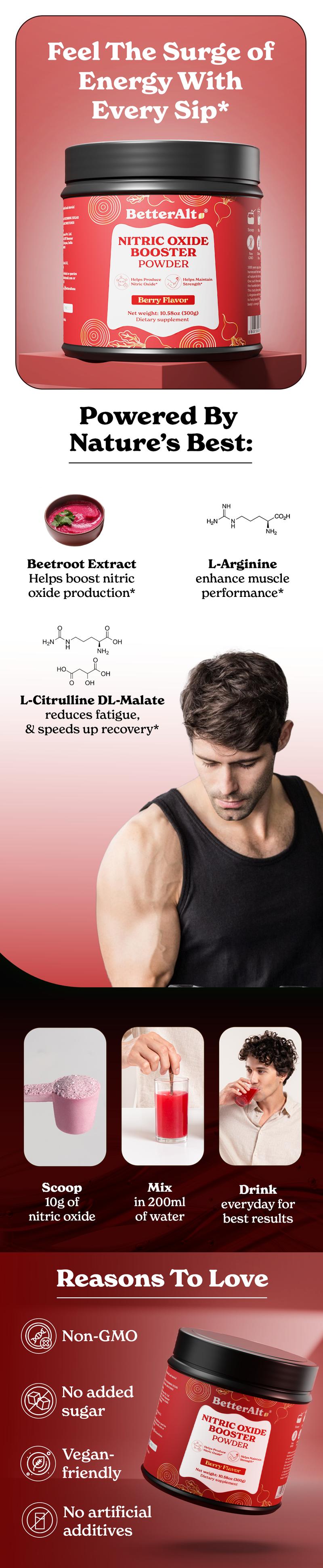 - BetterAlt Nitric Oxide Booster is a powerful blend designed to help enhance endurance, muscle strength, and recovery with a delicious berry flavor.*